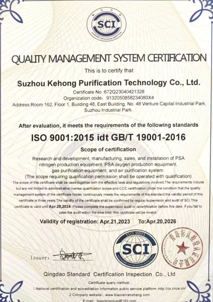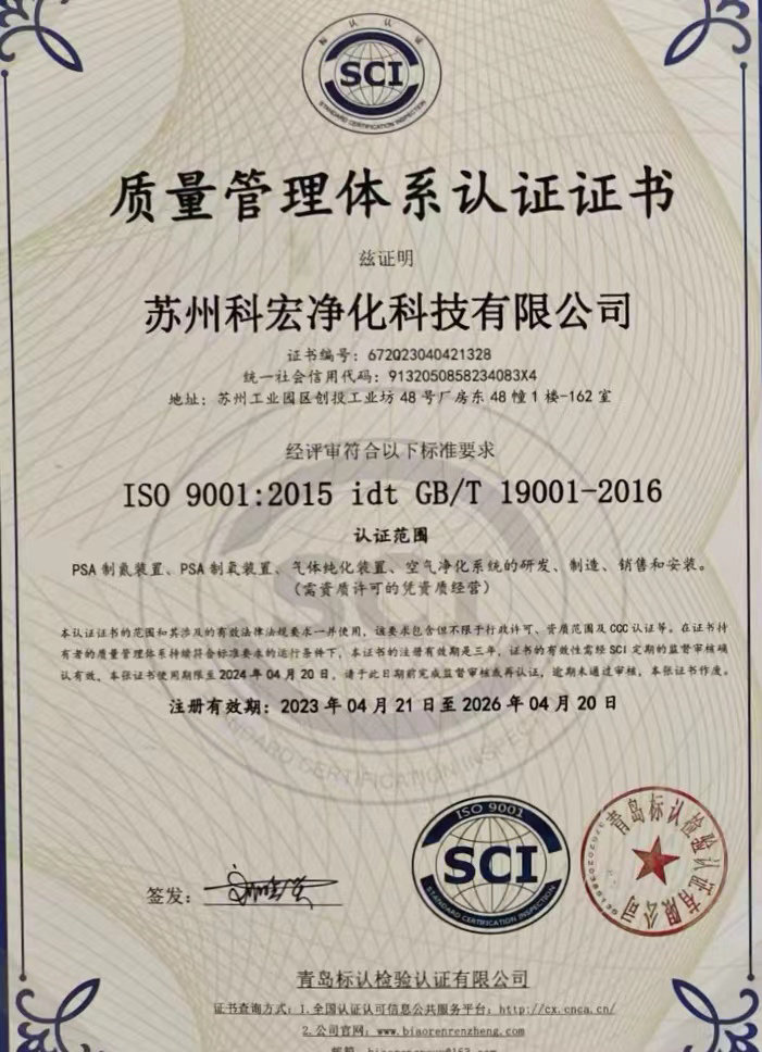 蘇州科宏凈化科技有限公司總部位于蘇州工業園區,是一家從事空氣分離PSA制氮機、氨分解制氫、PSA制氧機、壓縮空氣及凈化系統配套系統的研制、開發、制造以及相關技術服務咨詢的高科技企業。